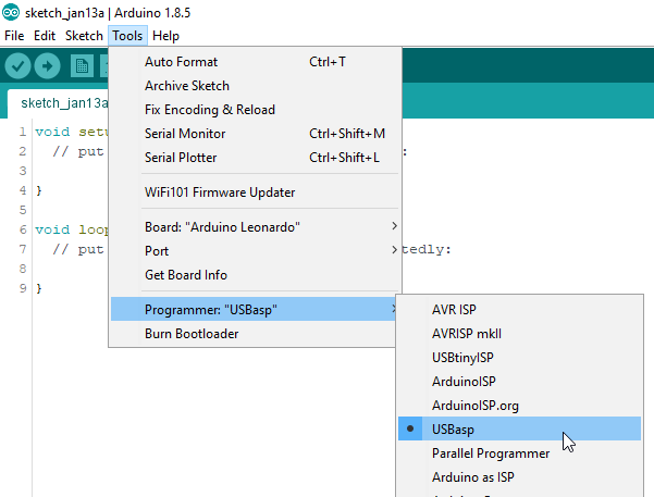 - Select the Programmer: “USBasp”