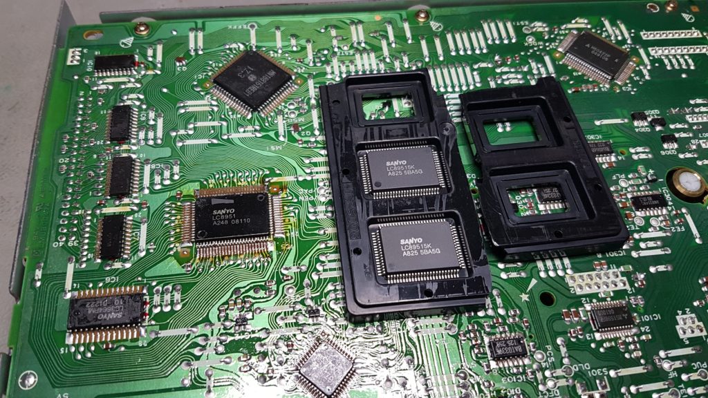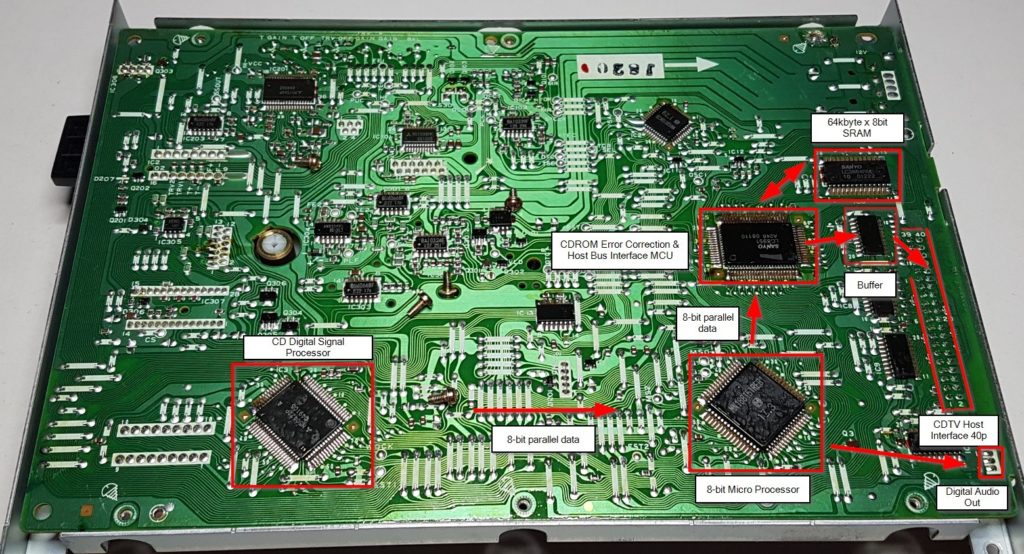 The digital section starts at the CD DSP, to the left. It takes the analogue signal from the lens (‘eye pattern’) and converts it to a 8-bit parallel digital stream. Then the micro looks for audio packets and creates a serial digital stream that goes to the CDTV with the 3-wire cable. It also (always) sends 8 bits of data towards the error correction MCU.