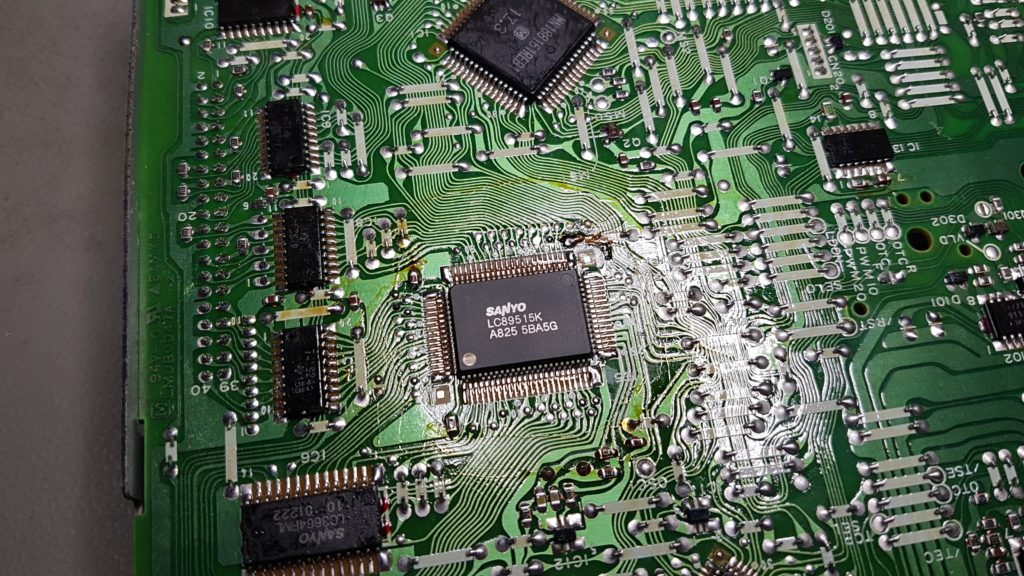 Another issue that can occur with the CDTV is leaky capacitors. The drive mainboard uses miniature aluminium electrolytic capacitors, and sometimes bad quality ones are used that start to leak. It will make the drive not work at all, on insertion of a cd it will spin 1/4 rotation and just stop.